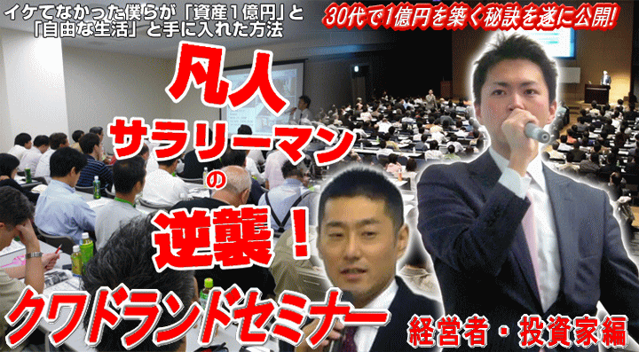 凡人サラリーマンの逆襲クワドランドセミナーにご参加ご希望の方は 以下のフォームにてお申し込み下さい。 ◆定員 30名 ⇒ 残席 【2013年度】 30代で1億円の資産を築く会 主催 「凡人サラリーマンの為のクワドランドセミナー 講師 増山大 小林大祐 ◆概要 ⇒ ご好評にお答えして2012年出版記念セミナーでお伝えした 30代で資産1億円以上を築く為の秘訣である「労働者」・ 「自営業」・「投資家」・「経営者」クワドランドの 2013年度版詳細「具体事例」を交えお伝えします。 【日程】 2013年 9月14日 (土) 2013年 10月13日 (日) 【時間】 午後13時30分 受付開始 【講演】 午後14時00分 ~ 午後17時00分程度(約3時間00分 質疑含む) 【懇親会】午後18時00分 ~ 20時00分程度(約2時間00分程度を予定) 【場所】 東京都千代田区サニー貸会議室 http://s-kaigi.jp/access.html 401号室 【参加費 】 ①【セミナーのみ参加】 【通常価格】 受講費 2,5000円 ⇒ ◆【特別価格】 3,000円 ②【セミナー、懇親会ともに参加】 【通常価格】 ⇒ 受講費 25,000円 + 懇親会費 4000円 ⇒ 合計 29,000円 ⇒ ◆【特別価格】 7,000円 下記お申し込みフォームから登録いただくと、事務局より返信メールが届きます。 返信メールに記載された銀行振込先へ参加費をお振り込みください。 「ご予約確定」には事務局からご連絡をお受け取り後3日以内のご入金に ご協力下さい。申込が込み合いました場合入金期日を越えましたらキャンセル扱い となる事がございますので、速やかなご入金お願いいたします。 ※「キャンセル待ち」をお申し込みの場合はご入金なさらずに事務局からのご連絡を お待ちください。キャンセル発生次第順次ご連絡差し上げます。 ※懇親会は会場予約の関係上事前予約された方以外はご参加いただけませんので お申し込み時にお忘れになることなく申し込みされますようご案内申し上げます。 |